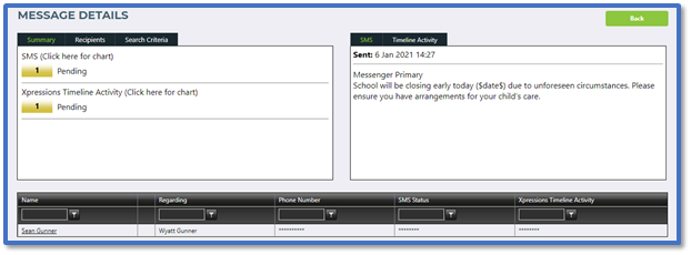 Select the blue info icon to go to the Message Details page. This will show you the full contents of the messages and the intended recipients. Read our guide for further information: Messenger: Check Message History.