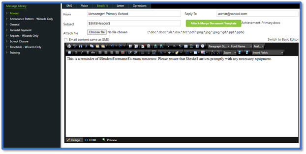 - Click Attach Merge Document Template to use the mail merge feature. Read our guide for further information: Messenger: Send Merge Documents.