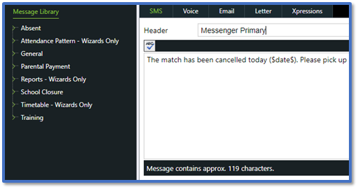 The Header is the opening line of the SMS, usually used for the school name. You can use the default SMS Header or change it to something else. Read our guide for further information: Messenger: Change the SMS Header.