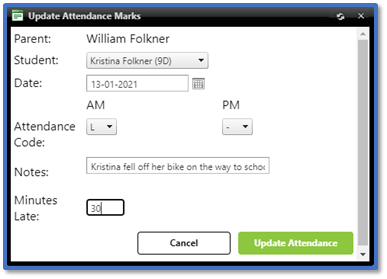 In Minutes Late, enter by how long the student was late if applicable.